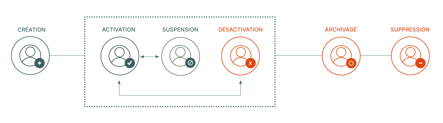 Sur le schéma ci-dessous, nous détaillons le cycle de vie au sens « Memority ». L’identité est d’abord créée pour permettre aux équipes support de préparer ses équipements et ses potentiels accès. Au début de son contrat de travail, l’identité est activée, et c’est à ce moment que sa vie dans l’entreprise débute. Au fil du temps, son compte peut être mis à jour, suspendu, ou encore désactivé. Une fois la fin de son contrat dépassée, l’identité est supprimée, ses accès sont coupés et aucune authentification n’est plus possible.