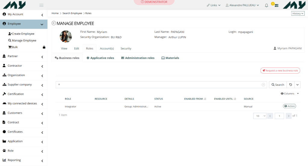 Memority’s role model is highly dynamic and allows to manage administration rights in Memority, applications accesses, equipment, business roles, contracts and more. In a word, we can represents anything as a resource assigned to a user. To do that, we use several concepts: