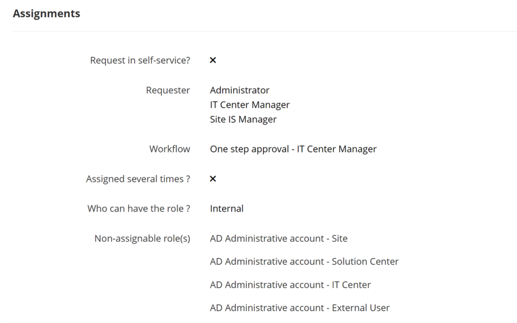 • Self-service request : define if a user can request the role for itself