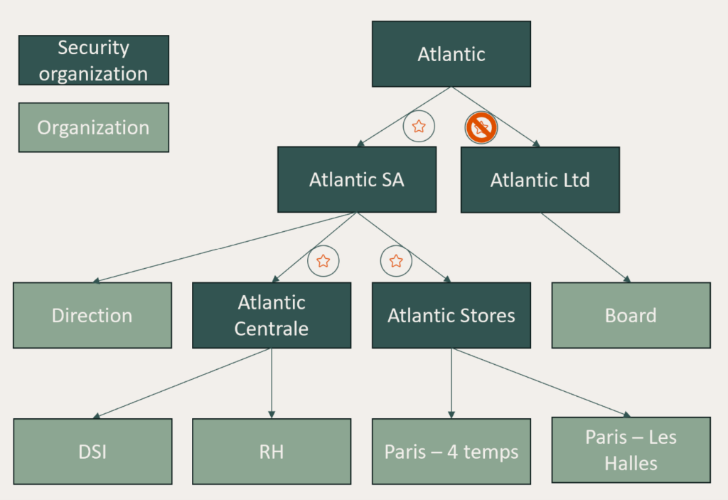 As you can see in below picture, security organizations and business organizations can be defined in the same tree, but managed separately. The goal is to determine user’s security organization thanks to his business organization to simplify the user’s management. In this tree, we published a role on Atlantic SA (the role represented by a star is visible and can be assigned to users), but not on Atlantic Ltd (the role is not visible). We can notice that publications are applied by default to all children organizations, so the role is also published on Atlantic Centrale and Atlantic Stores. If we want to publish the role only for some children organizations, we can set a non-publication to explicitly exclude these organizations from the publication.